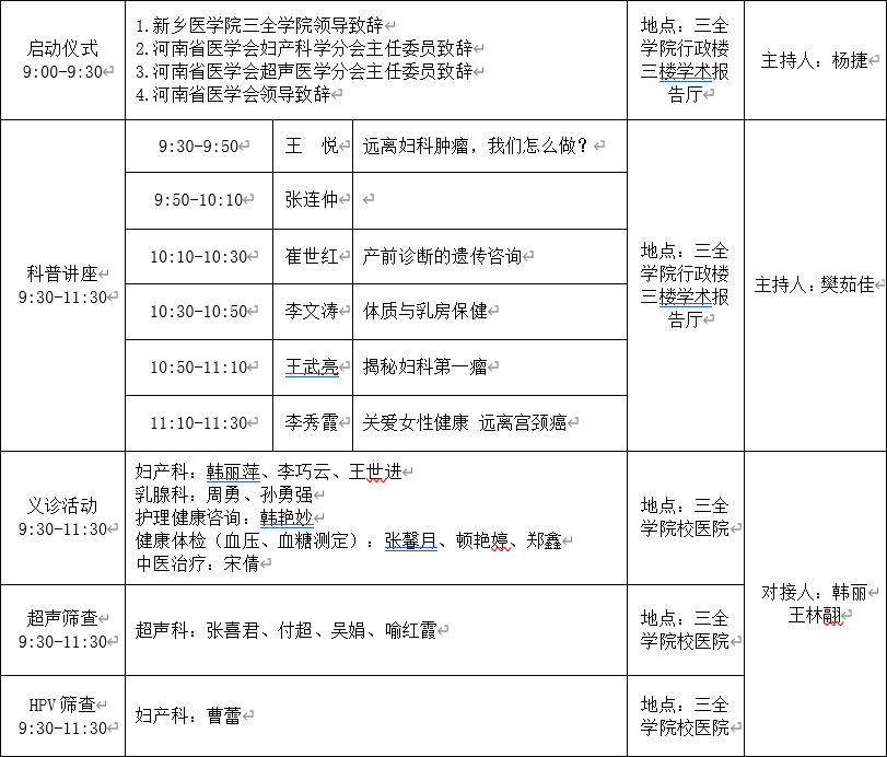 2022年3月8日是第112个“国际妇女节”,为积极发挥河南省医学会名医名家技术优势和名医大家示范效应,大力开展名医名家走基层·送健康系列公益活动和科普日活动,根据河南省卫健委机关党委有关要求,定于2022年“国际妇女节”期间组织我省名医名家走进我校开展“关爱女性健康科普讲座暨大型义诊活动”,本次活动同时以线上形式在省卫健委及同楼各单位进行开展。 一、活动组织与管理 主办:河南省卫生健康委员会 承办:河南省医学会 协办:新乡医学院三全学院 二、活动地点 活动设学术报告厅和校医院两个分会场 三、时间安排