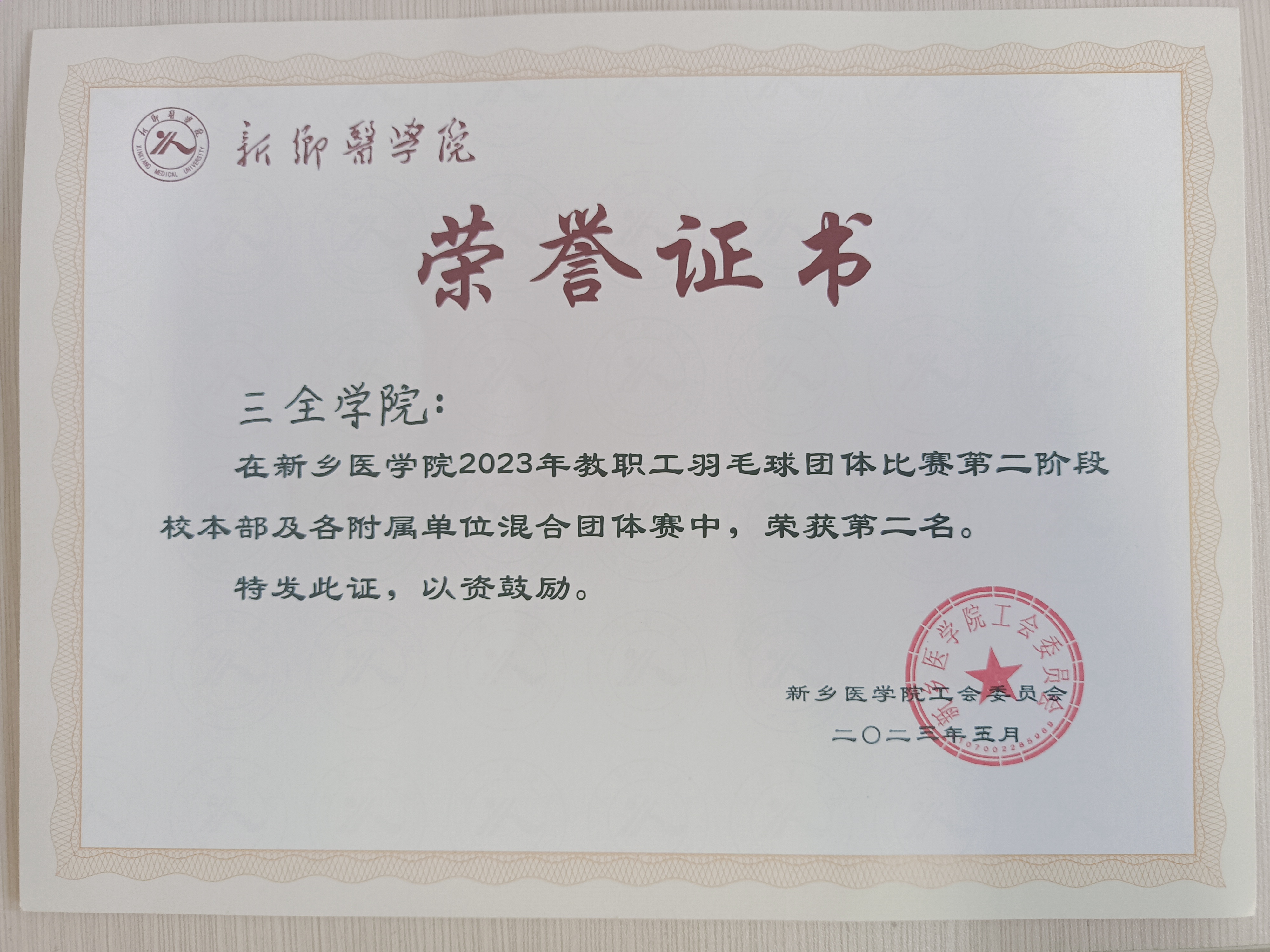 5月22日,新乡医学院2023年教职工羽毛球团体比赛顺利落下帷幕。我校教职工羽毛球队努力拼搏,积极进取,一路过关斩将,最终5胜1负,斩获团体二等奖历史最好成绩。 我校教职工代表队参加本次比赛的第二阶段比赛,并与校本部、第一附属医院、第二附属医院、第三附属医院、附属中心医院、附属人民医院等七个单位派出的代表队进行循环比赛。比赛采用混合团体赛,比赛项目包括男单、女单、男双、女双、混双等,采用五场三胜制,每场先到31分为胜。 为备战此次比赛,我校教职工羽毛球俱乐部认真筹备,积极训练,最终选拔12名教师参加比赛。此次比赛,教师代表队用实际行动践行了习近平总书记“没有全面的健康,就没有全面的小康”的理念,进一步增强了教职工身体素质,充分发挥了教职工的团结协作、顽强拼搏、积极向上的精神风貌。 赛后,队员们纷纷表示,通过此次比赛的锻炼,教职工羽毛球队队员们的技术水平和综合素质都有了很大提升,他们将以更加昂扬的斗志和饱满的热情,积极投身到学校改革与发展事业中,贡献自己的青春与热血。