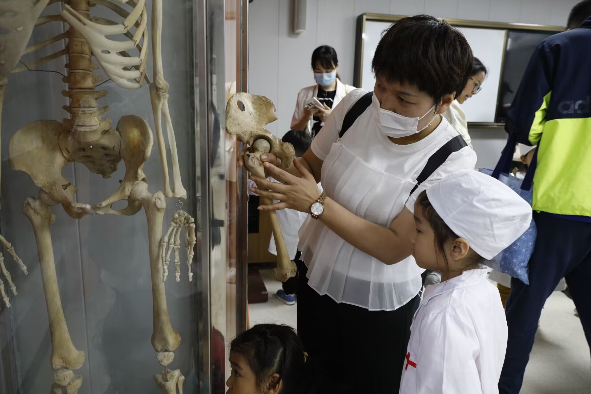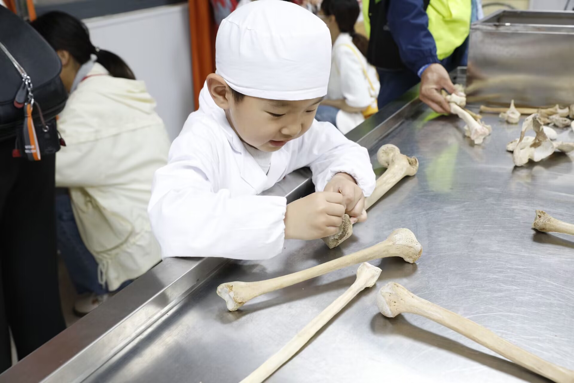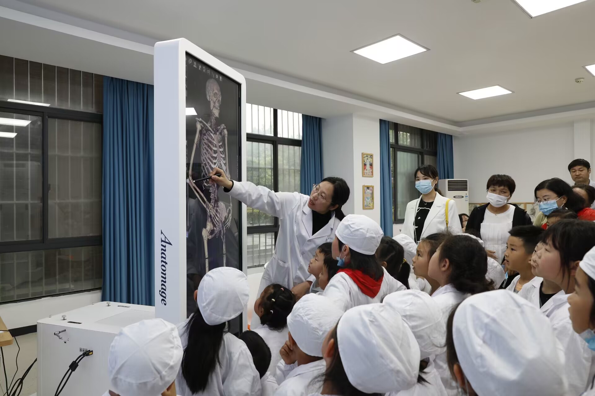 “苗苗老师我知道我是在妈妈肚子里长大的!““苗苗老师我想看一下我们吃进的食物都去了哪里呢?”人体解剖学虚拟仿真实验室里,孩子们带着好奇提出各种问题,人体解剖学副教授苗莹莹利用虚拟仿真解剖台耐心地为孩子们进行解答。在讲到妈妈十月怀胎带来的身体变化时,告知孩子妈妈十月怀胎的辛苦,让孩子们张开双臂紧紧的拥抱妈妈对妈妈说一声”您辛苦了”。通过对骨的有机成分和无机成分讲解,告知孩子们老年人无机质含量高,脆性增加而易骨折。教导孩子们在日常生活中关爱老人,身体力行的去帮助老年人。通过并通过人体骨架复原小活动,让孩子们进一步了解我们人体关节的组成和常见脱位方式。通过人体奥秘探究让孩子们感叹生命伟大,教育孩子珍爱生命、珍爱健康。