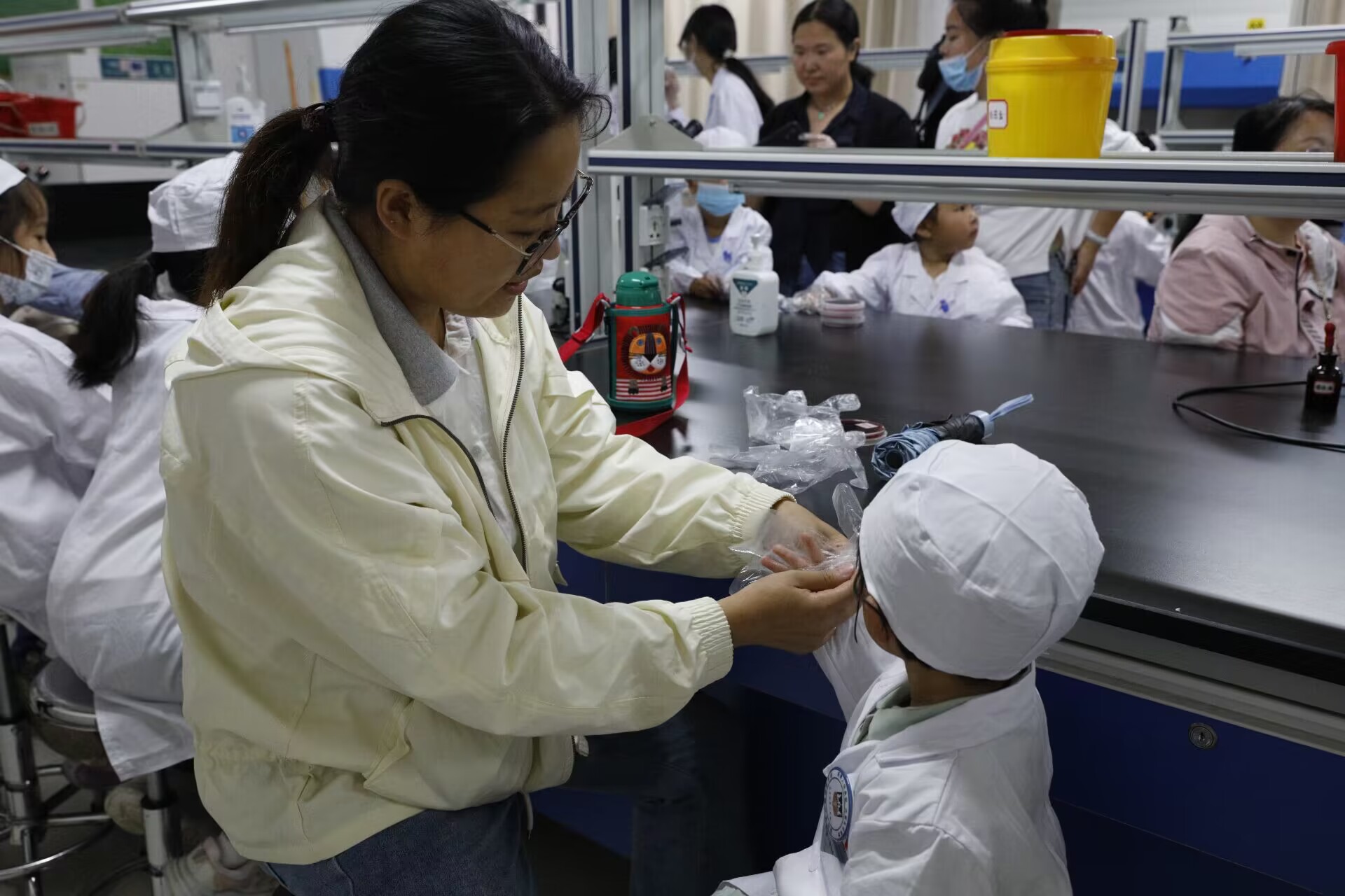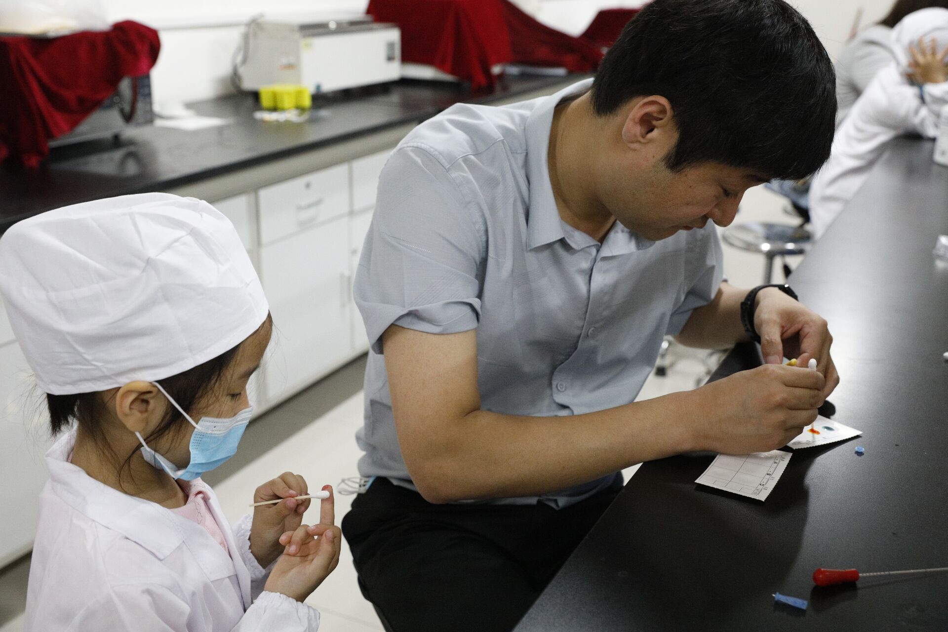 “通过将采集到的爸爸妈妈的指尖血,加入A型和B型血清当中,来观察凝集现象判断血型。”面对着一个个看着自己的好奇目光,医学检验学院的杜纪英老师耐心地向孩子们讲解如何血型鉴定,孩子们也都被血液与试剂的神奇反应所吸引。通过展示有趣的检验化学实验,让孩子们感受到科学实验的魅力,了解到做实验是需要科学严谨的态度和认真仔细的观察,在他们心中悄然种下了医学的种子。