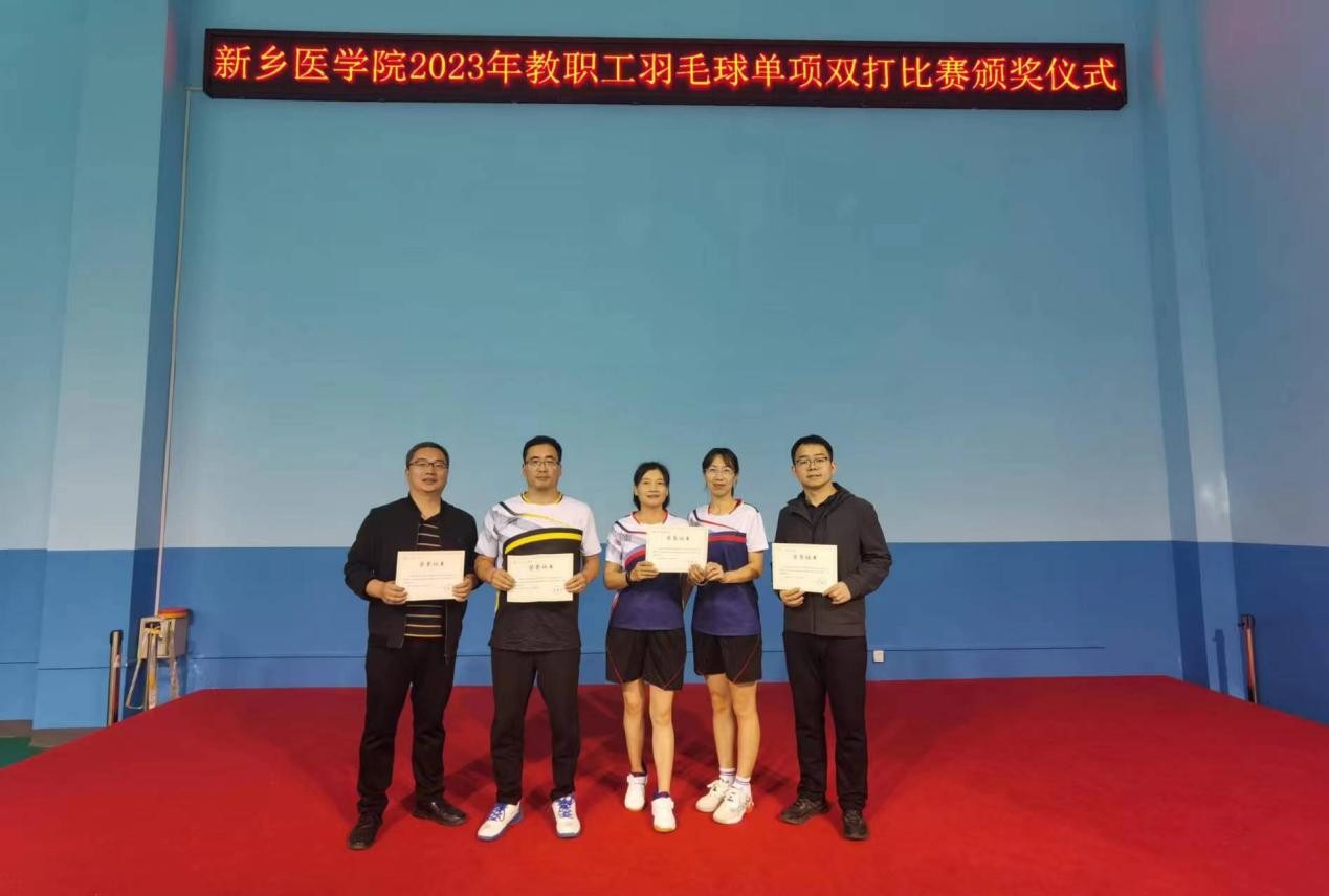 2023年10月24日,新乡医学院2023年教职工羽毛球单项双打比赛顺利落下帷幕。我校教职工羽毛球队努力拼搏,积极进取,一路过关斩将,最终男双代表队王耀峰和杨清云组合、童华鹏和王宝贵组合、董卫国和卢明臣组合分别获得了第四名、第五名和第六名,女双代表队郭祥玲和朱美娴组合获得了第六名的好成绩。 我校教职工代表队参加本次比赛的第二阶段比赛,并与校本部、一附属医院、第二附属医院、第三附属医院、附属中心医院、附属人民医院等七个单位派出的代表队进行循环比赛。比赛采用双打单项赛,比赛项目包括男双、女双、混双,采取抽签分组循环赛,再进行单淘汰比赛决出名次,每场先到31分为胜。 我校教职工羽毛球俱乐部对此次比赛高度重视,在会长和教练的带领下,队员们团结协作,刻苦训练,团队精神高度集中,积极应战。参赛的各代表队在比赛中展现了团结协作精神,不断挑战极限,充分发扬和彰显团队力量,将体育精神和精湛的球技展现的淋漓尽致。 运动员们在球场上的奋力拼搏,不仅全面推动全民健身与健康深度融合,进一步弘扬体育拼搏精神、团结协作精神,更是体现了我校教职工积极的工作态度、优秀的精神风貌,为学校改革与发展以及和谐、美好、文明、健康的校园文化建设贡献自己的一份力量!