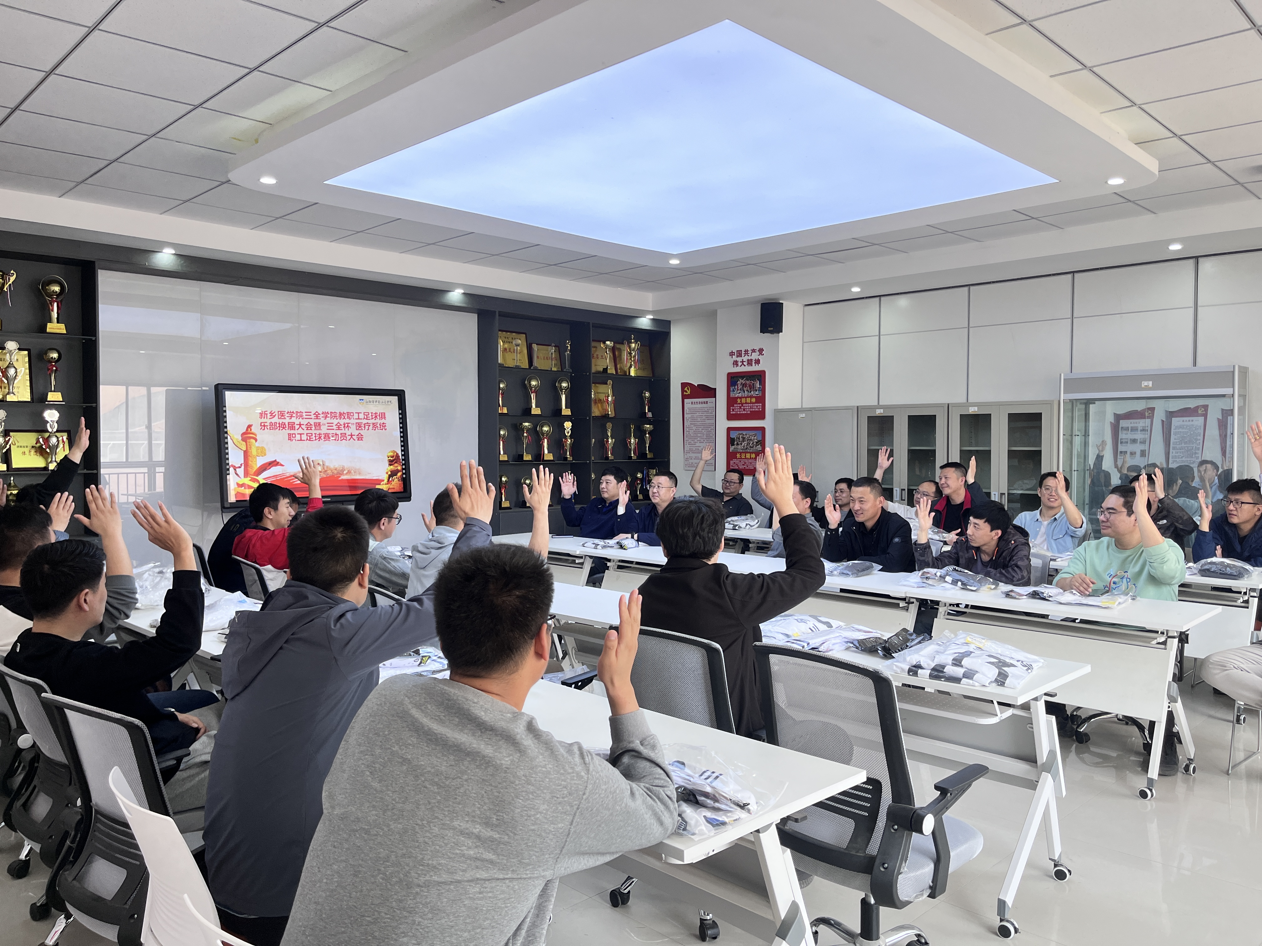 4月11日,校教职工足球俱乐部召开换届大会,来自全校20多个部门或学院的会员参加了会议。 会上,上一届教职工组织委员冯伟代表协会介绍了协会的基本情况,回顾了教职工足球俱乐部3年多来的发展历程,并就近几年来协会的活动情况进行了汇报。三全学院教职工足球俱乐部建队以来,在校工会的关心支持下,积极开展对外交流活动,代表学校与学校、医疗等单位进行足球友谊赛10余次,以“加强锻炼,增强体质,以球会友,增进团结”为俱乐部宗旨,坚持每周开展队内训练或校内外比赛,增进了校内外足球爱好者的友谊,丰富了教职工的业余生活,促进了学校教职工足球运动的普及和提高。 随后,会议根据《新乡医学院三全学院职工文体协会管理办法》及《新乡医学院三全学院教职工足球俱乐部章程》的要求,聘请白国强副院长为俱乐部名誉会长,以等额选举的办法选举产生新一届教工足球协会的会长、副会长、秘书长、副秘书长及委员。 随后名誉会长白国强副院长对教职工足球俱乐部一直以来的训练、比赛等各项工作给予了充分肯定。他谈到,教职工足球俱乐部是我校较早成立的教工群体运动团体之一。几年来,俱乐部在校工会的支持和全体会员的共同努力下,不仅通过足球与兄弟高校、医疗单位增进了友谊,加深了交流,宣传了学校,更通过足球增强了广大教职工的健身意识,形成了目前这个团结、拼搏、积极、乐观的教工体育组织——教职工足球俱乐部。 今后教职工足球俱乐部将依托学校良好的运动文化氛围、广泛的群众基础和良好的足球场地环境,继续坚持“每周一练,定期比赛”的良好传统,积极培养团队合作意识以及互帮互助精神,树立“快乐足球、健康生活”的理念,保持愉快轻松的状态投身到工作和生活中去。协会全体会员一致表示,一定认真遵守协会章程,服从协会领导安排,踊跃参加校内外比赛,大力宣传学校和协会组织,为学校的事业发展,为校园群体运动文化建设做出更大的贡献。