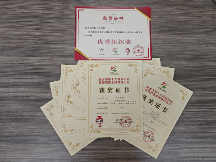 2024年9月19日至26日,新乡市第十三届运动会暨第四届全民健身大会足球比赛(市直机关组八人制)于新乡市体育场举行。我校教职工足球代表队在比赛中取得佳绩,荣获市直机关组三等奖及优秀组织奖的成绩。 此次比赛由新乡市人民政府主办,新乡市体育局、新乡市足协承办,为期8天,共有16支代表队,三百余名运动员参加,参赛单位均来自新乡市各机关及驻新高校。我校由朱光举、秦阳、冯伟等16名教职工组队,在副院长白国强的带领下首次参加社会性质比赛。在整个赛事过程中,我校教职工不畏艰难,奋勇迎战,表现出了高超的体育竞技水平和团结协作的团队拼搏精神。最终,我校教职工足球队在比赛中获得三等奖和优秀组织奖。 本次赛事,我校代表队高度重视,在赛前业余时间老师们放弃休息时间,多次组织了针对不同对手的训练。比赛中,队员们展现了良好的精神面貌,每一名上场队员拼抢积极、团结一致,充分发扬了敢于拼搏、勇于进取的竞技精神,充分展现了我校教职工良好的精神风貌,并进一步促进了我校与各单位之间的交流合作。此次赛事丰富了我校教职工文化生活,提高了教职工健康素质,振奋精神,以更加昂扬的精神风貌投入到以后的工作和生活中。