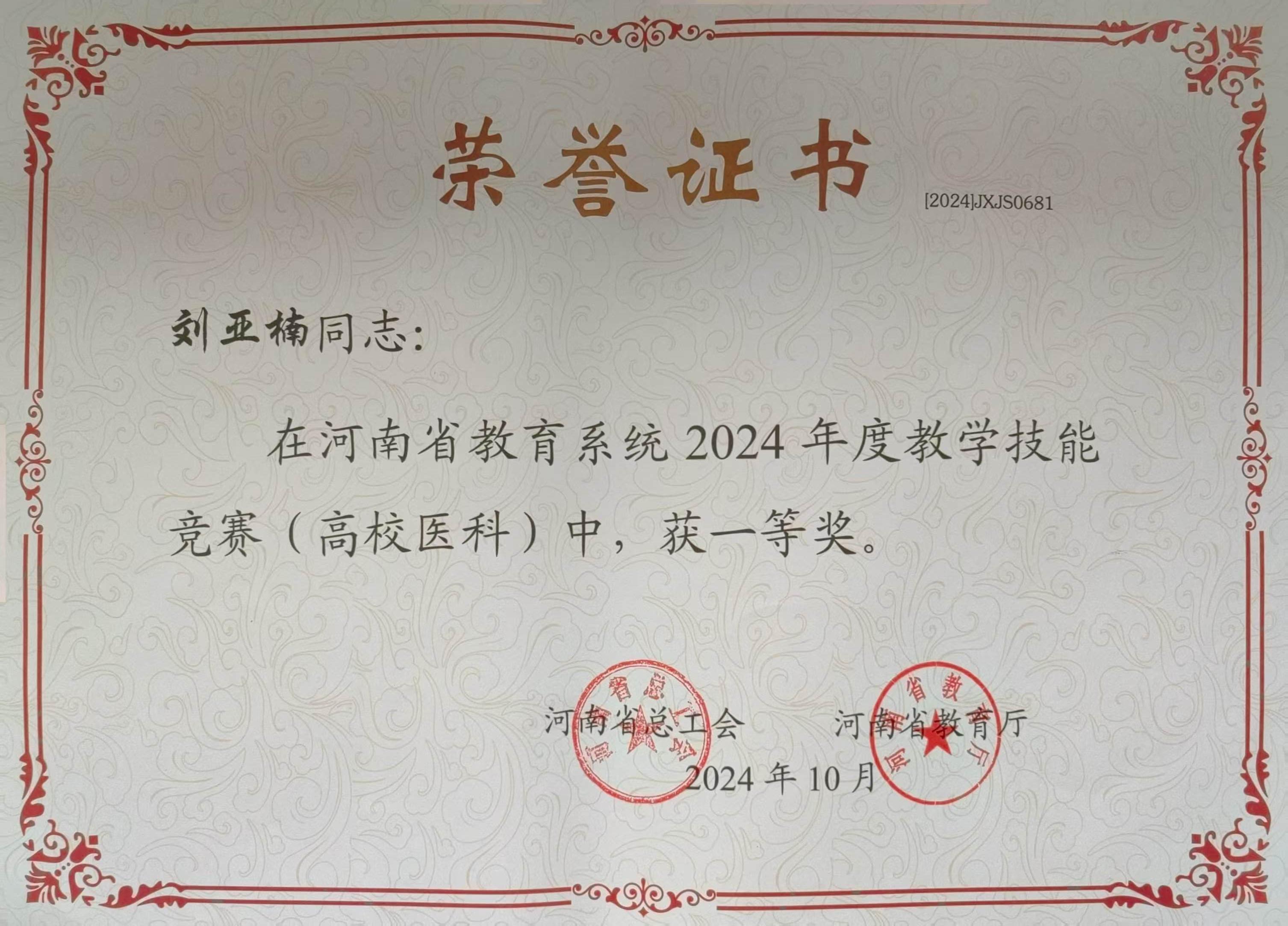 近日,河南省总工会和河南省教育厅联合下发了《关于河南省教育系统2024年度教学技能竞赛获奖情况的通报》(豫工文[2024 ]89号),表彰了2024年度全省教育系统教学技能竞赛中获奖的单位和个人,其中,我校教师刘亚楠荣获一等奖。 河南省教育系统教学技能竞赛是河南省总工会、河南省教育厅在全省教育系统组织开展的教学技能品牌活动,2024年度共开展了13个科目的教学技能竞赛,其中包含高等院校文科、经管科、理科、工科、医科、思政科6个科目,医科组共计85人参赛,经过视频决赛后,最终20人进入现场决赛。学校领导历来高度重视,相关部门和学院大力支持,赛前从组织申报、校内遴选、培训指导、设备保障等方面均做了细致周密的筹划和组织。刘亚楠老师作为我校唯一选手,在现场决赛中表现突出,凭借其扎实的基本功、教学设计和教学展示,赢得了评委的高度认可,最终取得全省高校医科组一等奖的好成绩。 此次教学技能竞赛是在全省高规格教育竞赛舞台上对我校教师教学能力和教学风采的一次重要展示,也是学校高质量教育教学改革成果的重要体现。未来,我校将继续围绕立德树人的根本任务,全方位打造师德高尚、业务精湛、充满活力的专业化教师队伍,为实现学校事业高质量发展提供人才保障。