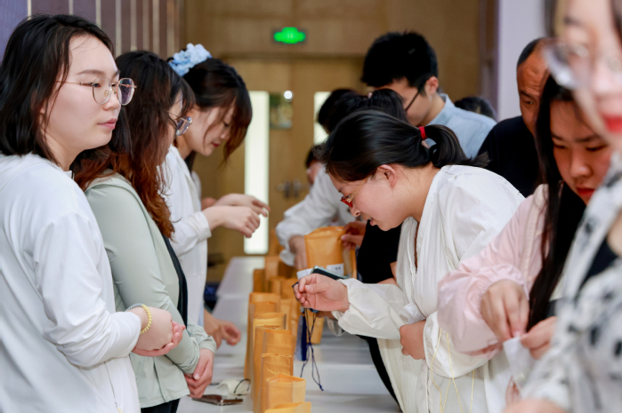 讲座结束后,活动进入“香囊DIY手作”环节。俱乐部为每位参与者准备了丰富的香囊材料包,包含艾草、薰衣草、丁香、陈皮等数十种芳香药材。在专业老师的指导下,大家根据个人需求,精心调配驱蚊、安神或理气等不同功效的香囊配方。活动现场药香弥漫,欢声笑语不断,许多老师还发挥创意,制作了独具特色的个性化香囊,既可作为随身佩戴的养生小物,也可赠予亲友传递端午祝福。活动期间,俱乐部还特别准备了黑芝麻丸、养生茶饮等药膳小点,让教职工们在体验传统文化的同时,进一步感受“药食同源”的养生智慧。